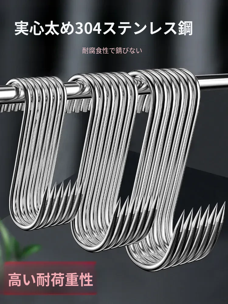 サビに強いステンレス製S型干し魚フック - 厚みのある尖った先端で、干し肉や野菜、焼き鴨の乾燥に最適!丈夫で実用的なデザインで、家庭での保存や料理の幅が広がります。