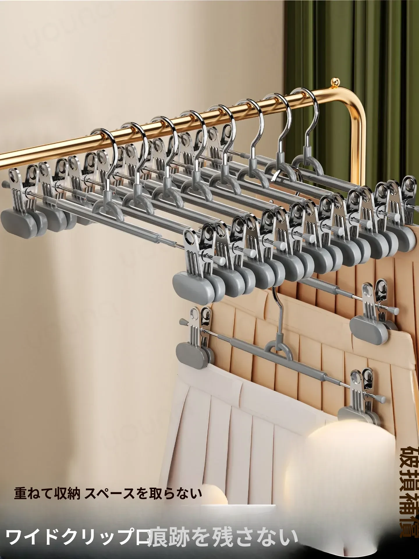 滑り止め付き!無痕の家用パンツハンガー、クリップ付きでズボンをしっかりホールド。ステンレス製のスカートクリップで、洗濯物も安心して干せます。収納にも便利なデザインで、あなたの衣類を美しく保ちます!