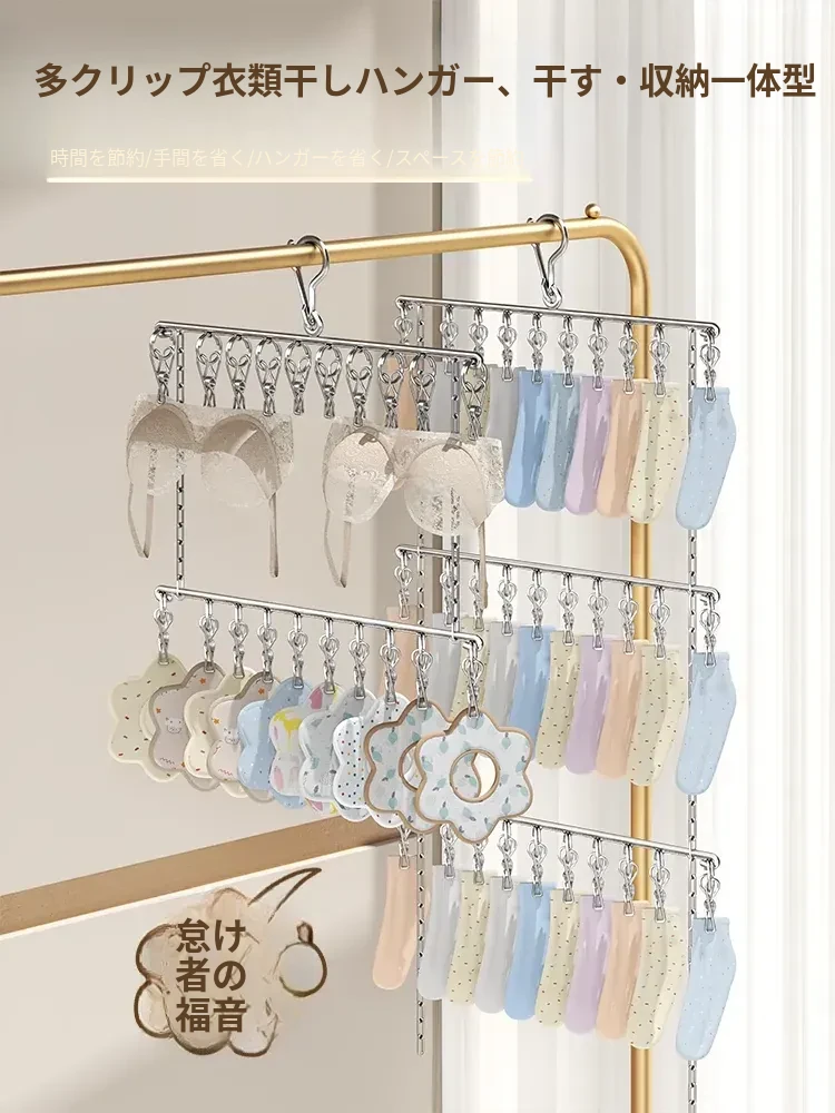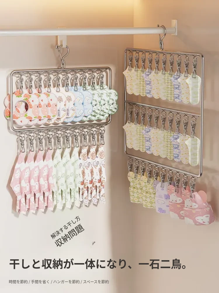多機能ソックス干しハンガー - ステンレス製、風に強く赤ちゃん用にも最適!衣類や靴下をしっかり固定できるクリップ付き。お家での洗濯がもっと楽しくなる便利アイテム!