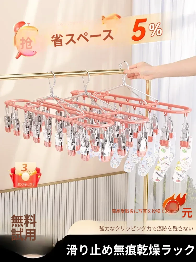 無痕ハンガークリップ付き!学生寮に最適な多機能防風衣類干し。下着や靴下も安心して干せる便利アイテム!