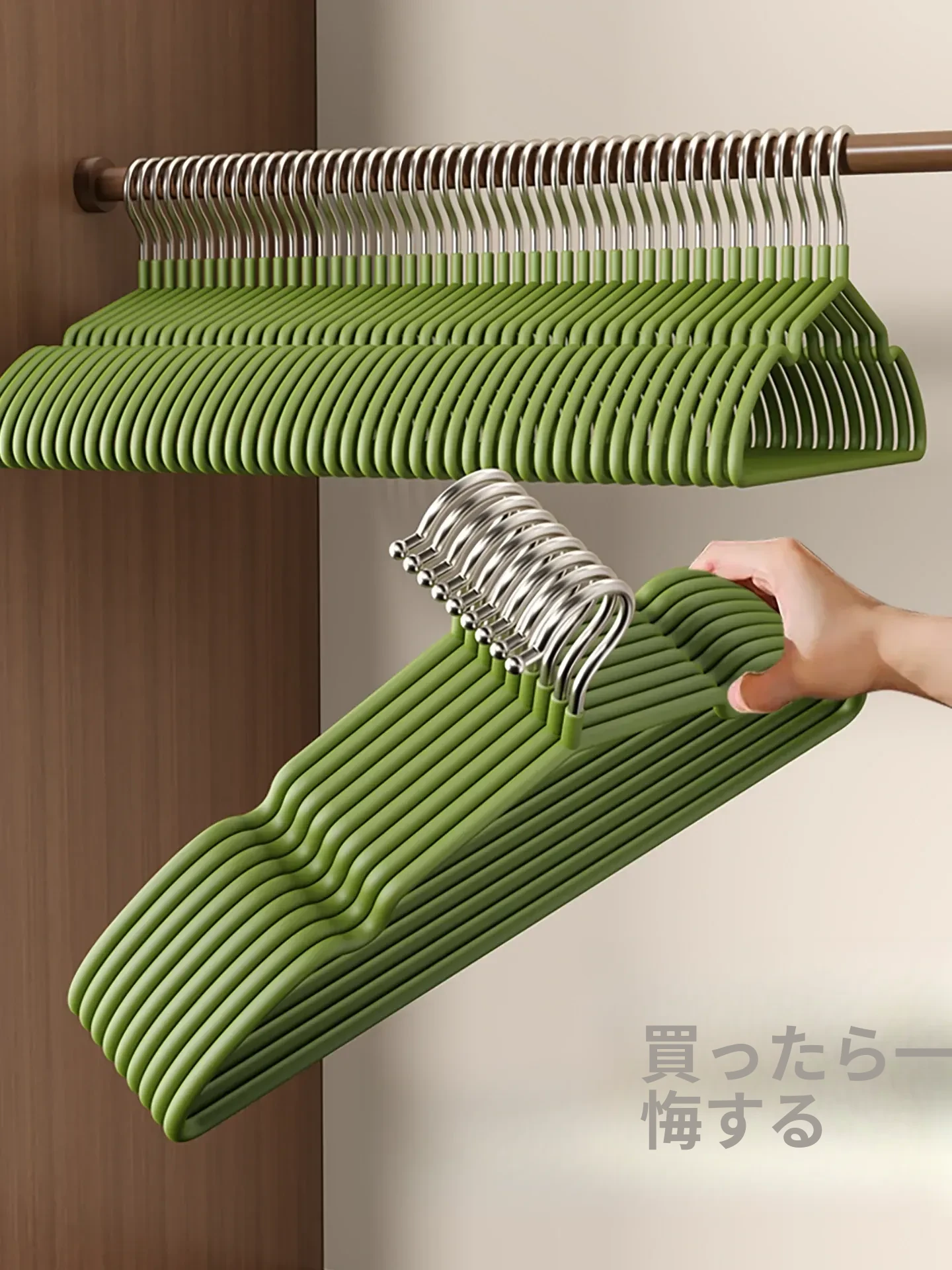 防滑無痕フロッキー衣類ハンガー - 家庭用・グリーン・クローゼット整理に最適!肩を守る角度設計で、衣類をしっかり支え、収納を美しく整えます。あなたのクローゼットにぴったりのアイテムです!